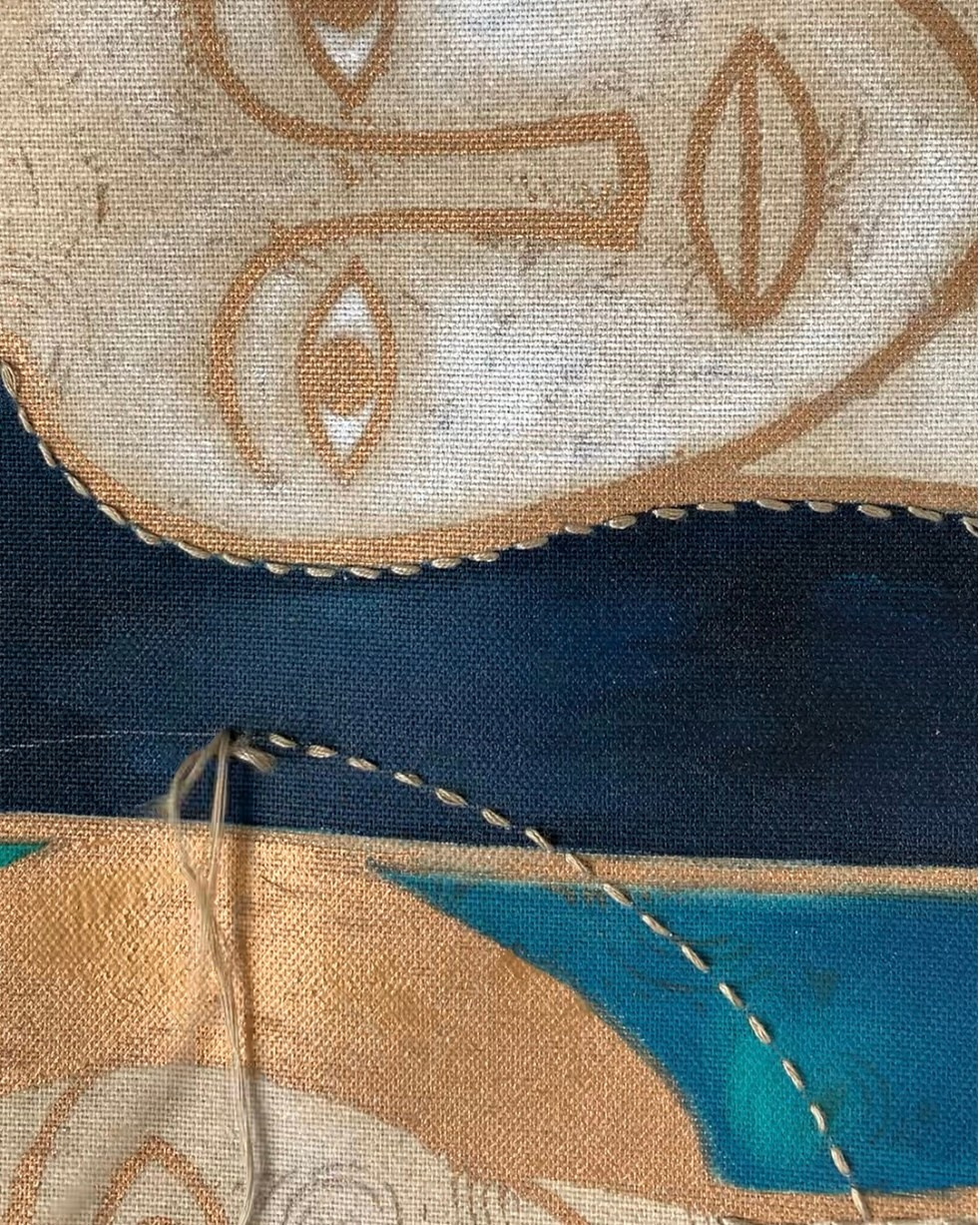 “Fish O ‘Clock” Mixed media, print on canvas, embroidery on canvas, oil on canvas 70×130 cm