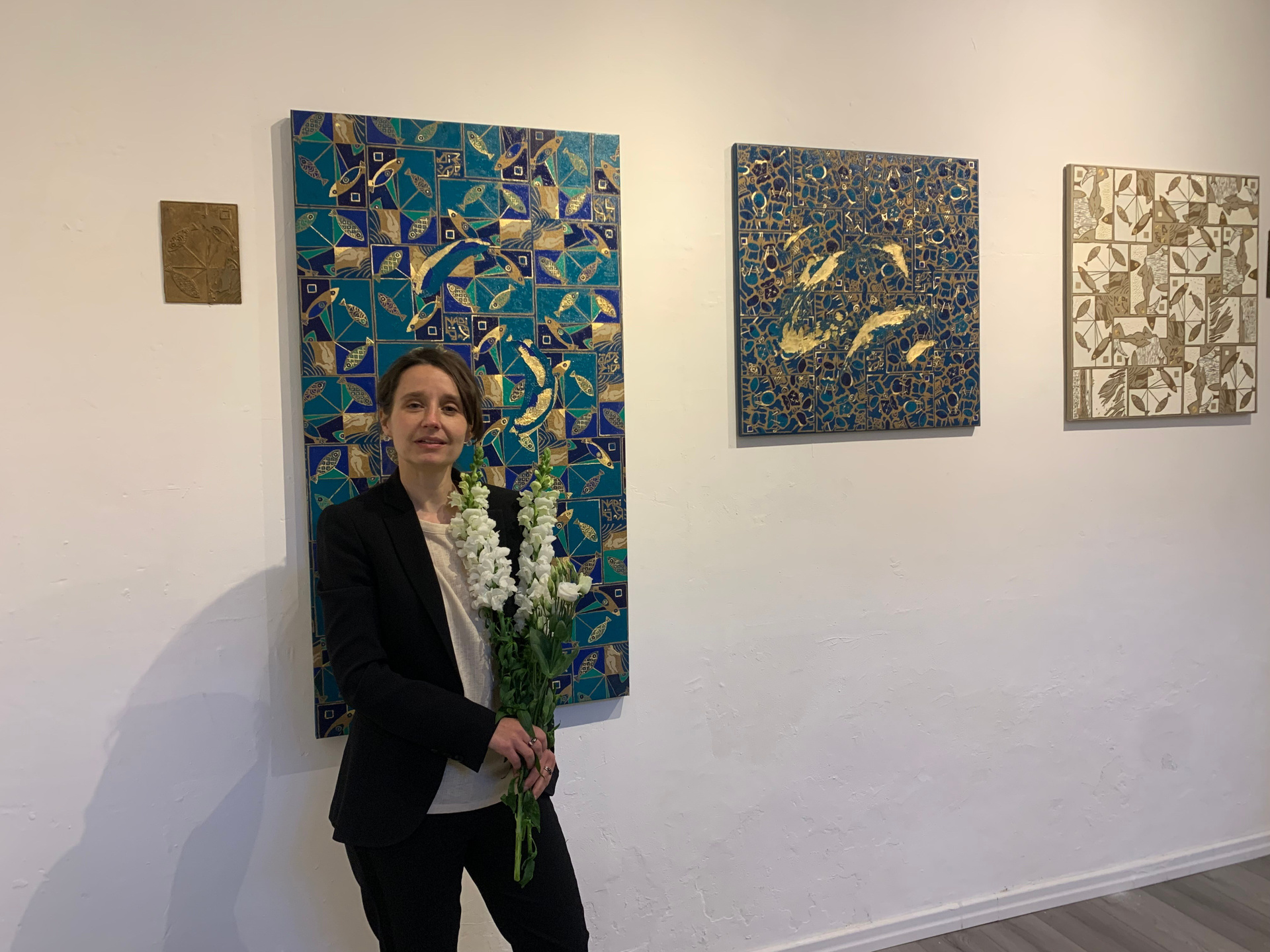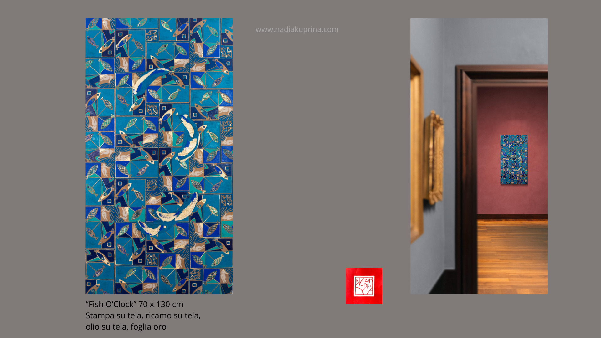 «Fish O ‘Clock» Tecnica mista, stampa su tela, ricamo su tela, olio su tela 70×130 cm