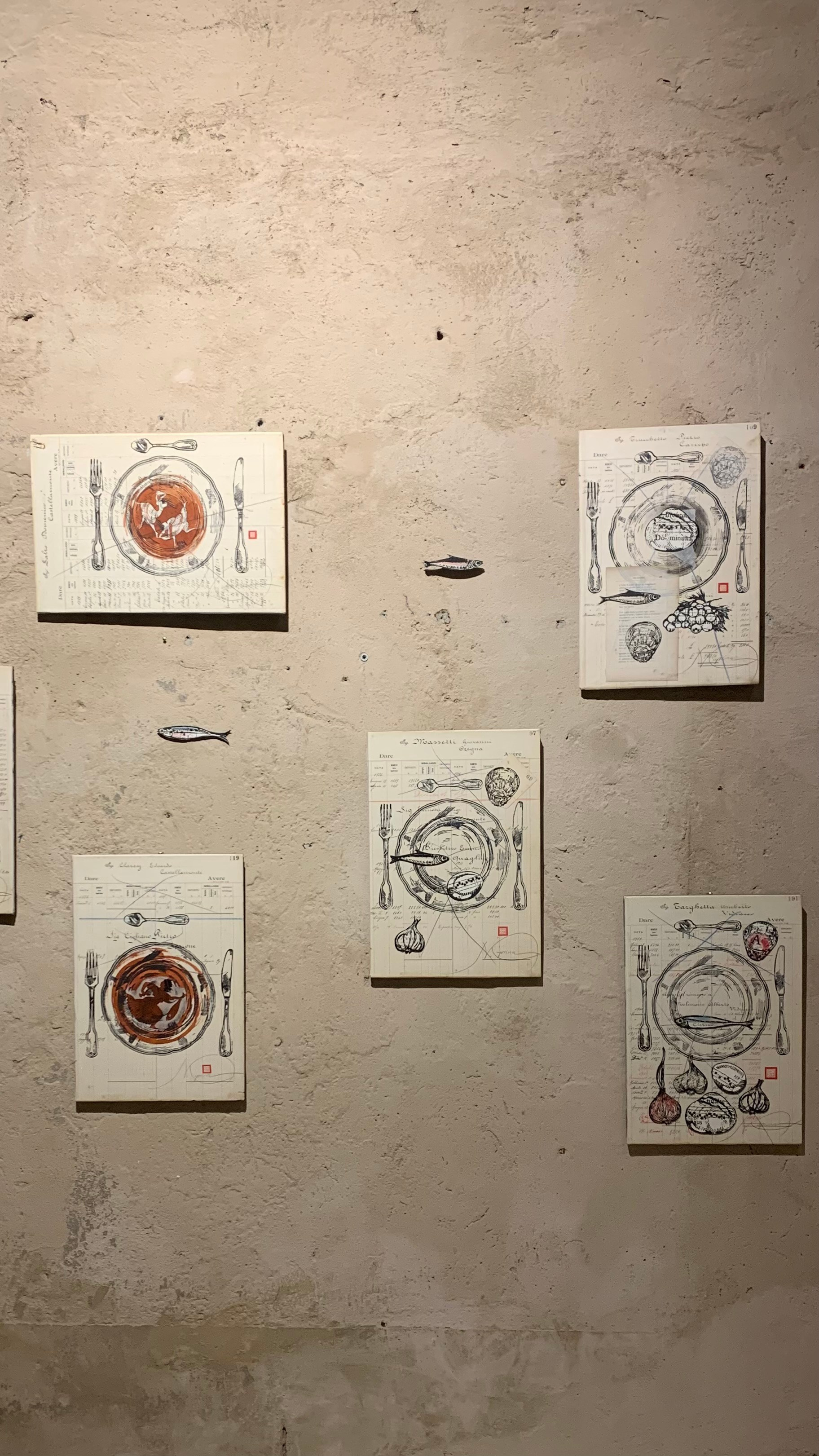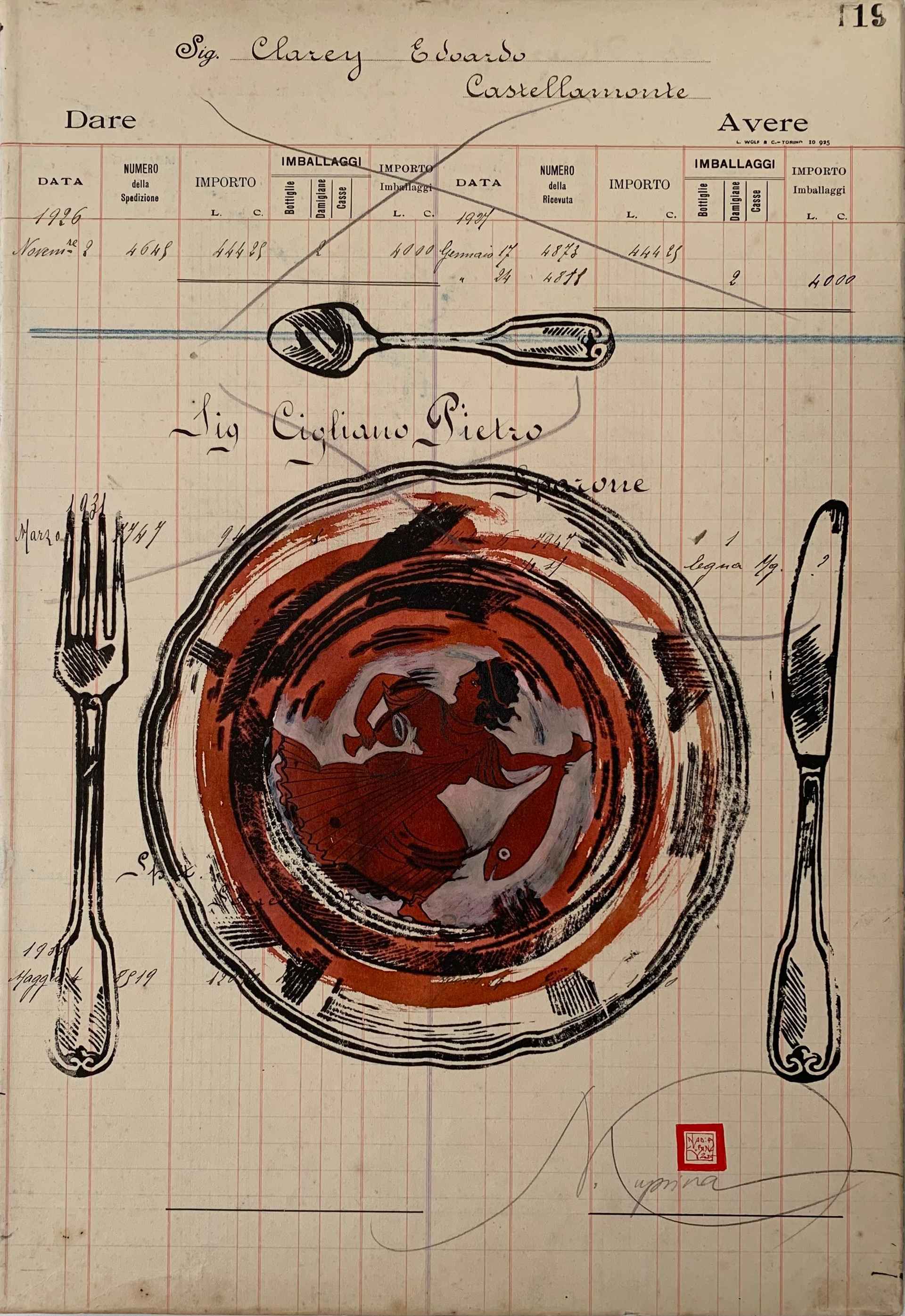 Nr. 119 PANEM QUOTIDIANUM. 29.5 cm x 43 cm Linoleografia stampata a mano su pagina di un registro di un’azienda vinicola del 1920. Ispirazione ellenica.